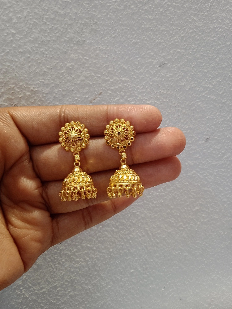 Design: Traditional dome-shaped jhumkas with intricate detailing